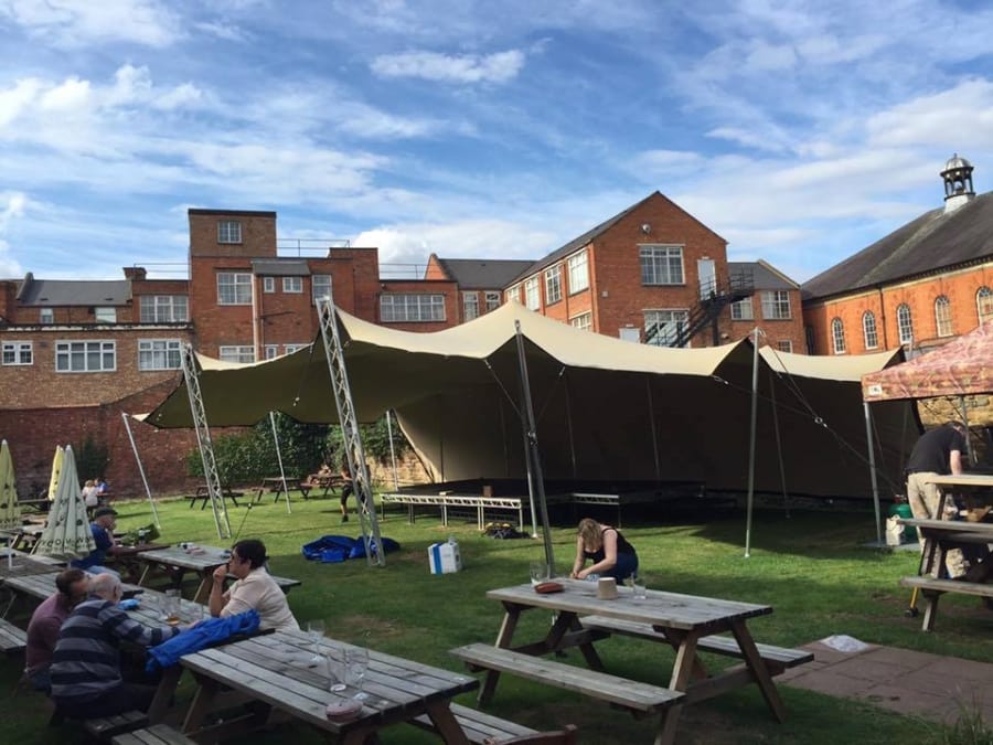 the stretch tent provides shelter for performers, speakers and equipment,